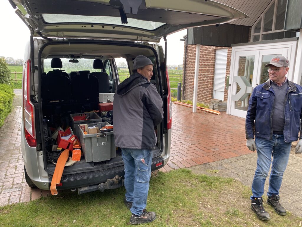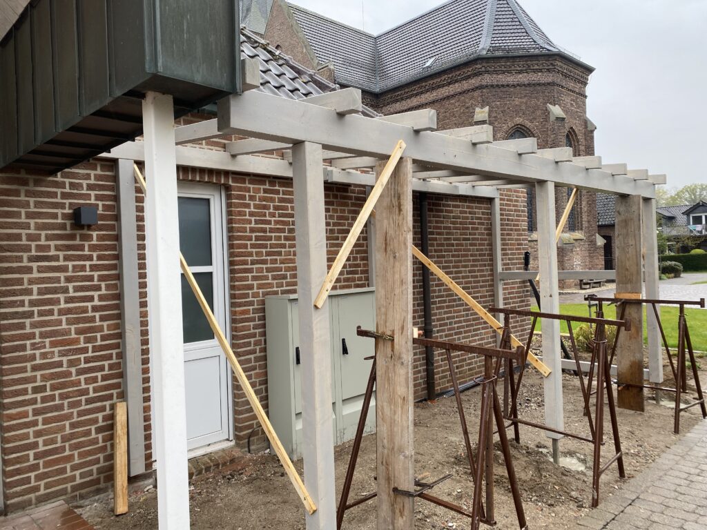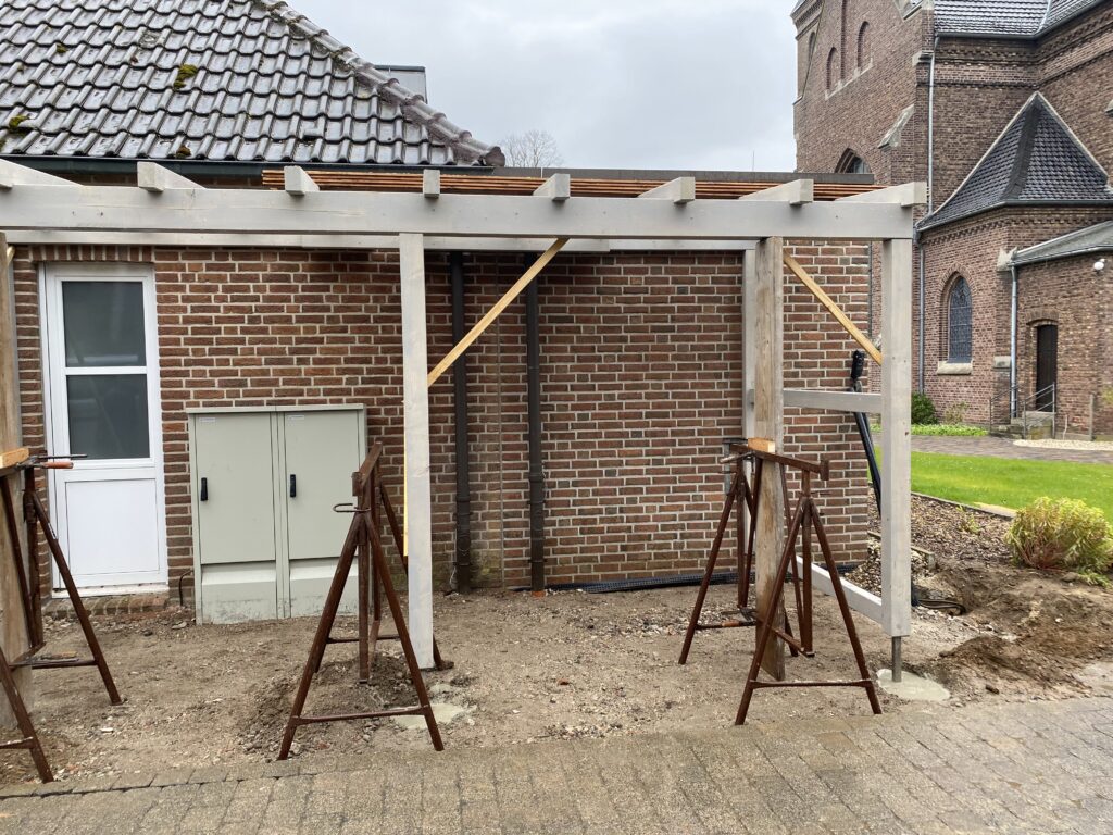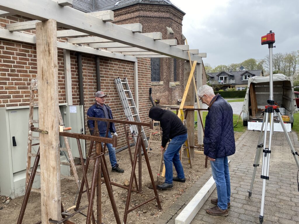 Wo sollen manche Sachen nur hin? Wo soll das Leergut hin, die Mülltonnen, und was ggf. noch so untergestellt werden könnte. Schreinermeister Peter Keusen hat hier professionelle Vorarbeit geleistet und mit Hilfe von ehrenamtlicher Unterstützung fachmännisch angeleitet. Auch wenns geregnet hat und nicht so schönes Wetter war – es hat prima geklappt!