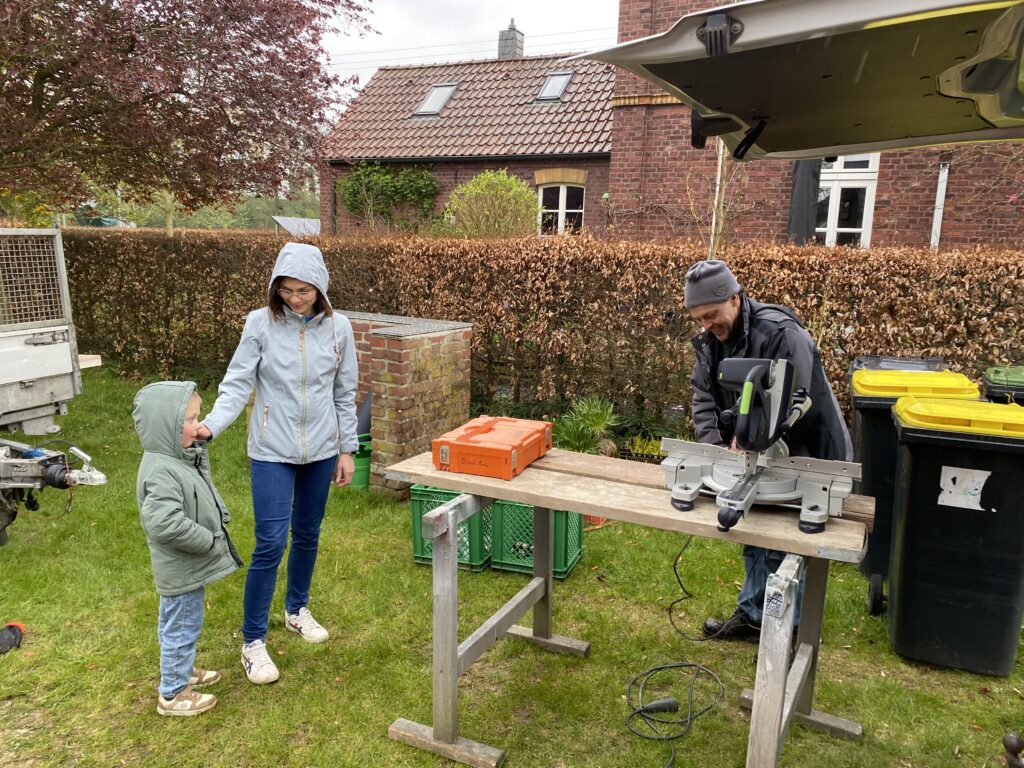 Natürlich musste das Holz vorher gestrichen werden. Aber auch da hatte der Schreinermeister gute Hilfe. Damit auch alles rechtzeitig für den Tag heute fertig war (Vorstreichen und Anstreichen der Hölzer) haben sogar seine Frau und sein Sohn kräftig mitgeholfen!