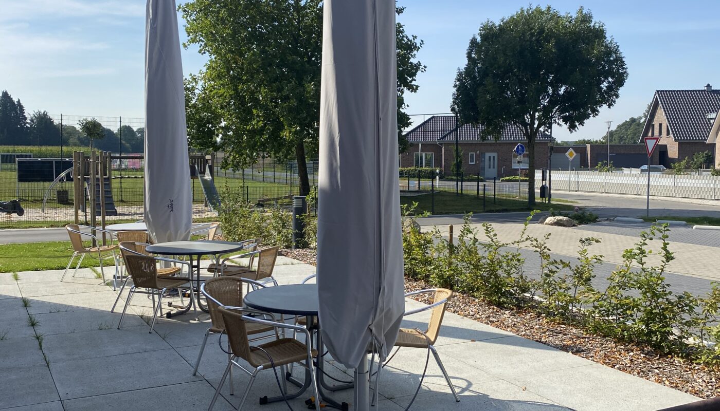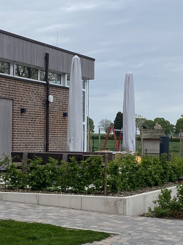 Nicht nur ich bin schweißgebadet! Sind diese Schirme schwer! Und dann passten die beim ersten Mal nicht die Löcher. Falscher Schirm für den falschen Ständer. Also der eine Schirm wieder raus, zum anderen Ständer „wullachen“ und mit vereinten Kräften aufstellen. Ich weiß schon, wann ich mich im nächsten Jahr nicht melde :-)))